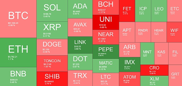BNB、SOL、XRP、ADA、DOT涨幅不大,LINK、PEPE日内涨幅都在3-4%左右。