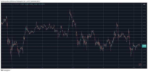 本周伊始,多头占据了主导地位,将比特币从不到 69,000 美元推高至每周最高 70,500 美元以上。然而,随着人们开始期待比特币可能挑战历史最高价 73,800 美元,形势发生了变化,到周二,比特币价格下跌了 3,000 多美元。