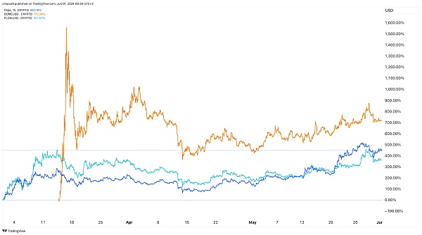 其他 meme 代币,如 dogwifhat (WIF)、Bonk、Book of Meme (BOME) 和 Dog Go to The Moon (DOG) 今年也表现不俗。WIF 的市值已飙升至 33 亿美元以上,而 Bonk、BOME 和 DOG 的市值则超过 20 亿美元。