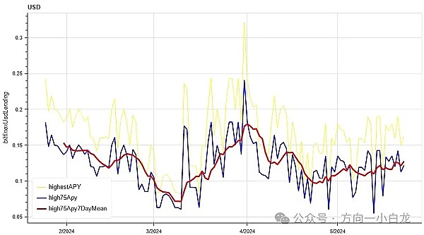 黄色线为 USD 利率的最高价,蓝色线为最高价的 75% ,红色线为最高价的 75% 的 7 天平均值