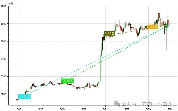 在 2024.05.20 ,根据彭博社分析师的消息:SEC 正要求交易所加快对以太坊现货 ETF 19 b-4 文件的提交,彭博社分析师并将以太坊现货 ETF 于 5/23 通过的胜率提高至 75% ,ETH 大涨 18% ,当日空头爆仓量高达 7500 万美金,直至 2024.5.23 正式通过后以太坊从最高 3950 美元下跌至最低 3524 美元,多头爆仓量高达 8816 万美金,随后反弹上升回 3800 美元。