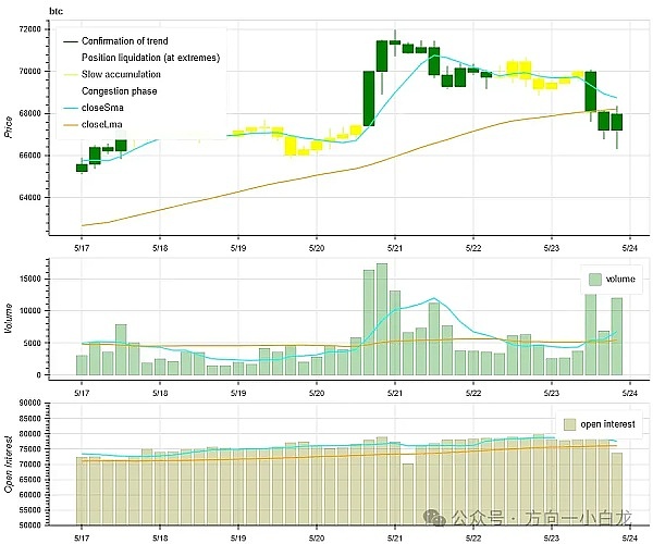 上图最上方 BTC 的价格走势,中间是成交量、最下方是未平仓量、浅蓝色是 1 天均值,橘色是 7 天均值。其中 K 线的颜色代表当前的状态,绿色是价格上升有成交量支持,红色是在平仓,黄色是在缓慢累积仓位,黑色是拥挤状态。