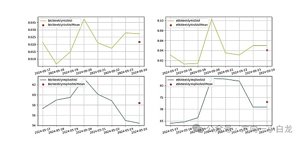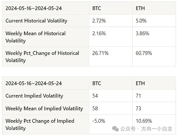 过去一周历史波动率 BTC 与 ETH 在 5.20 上涨时最高;隐含波动率 BTC 下降而 ETH 上升。
