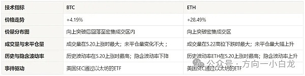 过去一周成交量 BTC 在 5.20 上涨时最大而 ETH 在 5.22 高位下跌时最大;未平仓量 BTC 变化不大而 ETH 大幅上升。