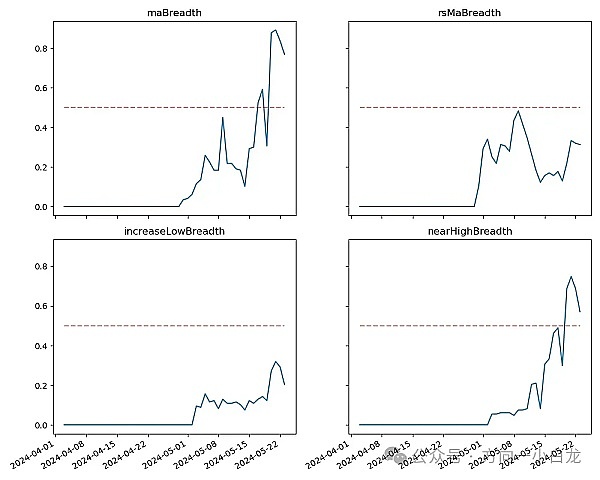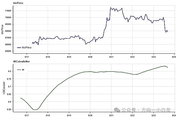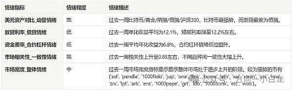 过去一周选中的 129 个币,价格在 30 日均线上方的占比为 77% ,相对 BTC 价格在 30 日均线上方占比为 31% ,距离过去 30 天最低价大于 20% 的占比为 20% ,距离过去 30 天最高价小于 10% 的占比为 57% ,过去一周市场宽度指标显示整体市场处于逐步进入上升趋势的阶段。