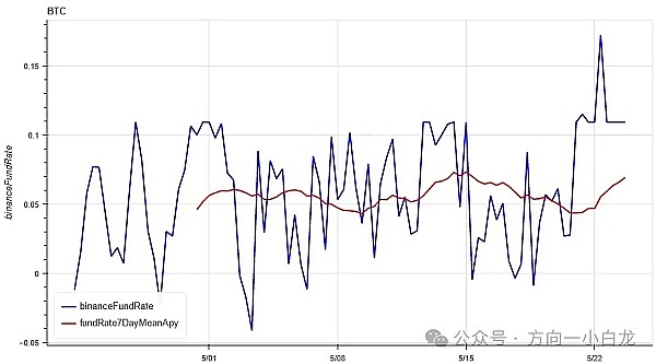 蓝色线为币安上 BTC 的资金费率,红色线为其 7 日平均