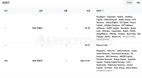 2024 年 5 月 30 日,去中心化资管协议 Babylon Finance 宣布完成 7000万美元融资,投资方包括 Paradigm*、Polychain、Bullish、HashKey Capital、IOSG Ventures、Amber Group、HTX Ventures、Galaxy Digital、LD Capital、Breyer Capital、imToken Ventures、P2P Validator、InfStones、ViaBTC Capital、Everstake、Bware Labs、Allnodes、Luganodes、Stakin、RockX、 等。