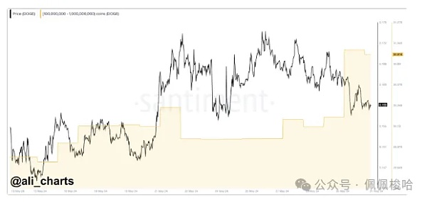 出现了新的更新,预计将改变狗狗币的市场动态,因为最近的鲸鱼活动表明该代币可能很快会迎来新一轮上涨。根据著名分析师Ali发布的 Santiment 数据,鲸鱼已经加大了对狗狗币的囤积力度,此前狗狗币的囤积量已经下降了很长一段时间。
