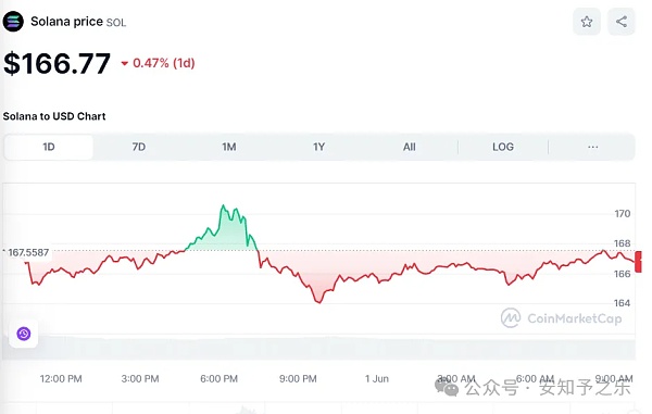Solana(SOL)的价格在过去 24 小时内下跌 0.47% 至 166.77 美元。其 24 小时最低价和最高价分别为 163.93 美元和 170.63 美元。
