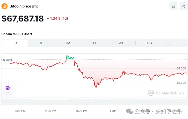 今日,比特币(BTC)的价格图表显示,在过去的 24 小时内下跌了 1.34%,跌至 67,687.18 美元。此外,过去 24 小时的最低价和最高价分别为 66,633.42 美元和 68,999.57 美元。