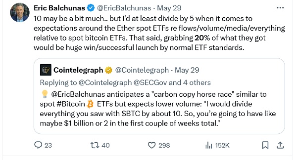 因此,“我们可能不会在第一天看到以太币 ETF 的流入量达到比特币 ETF 那样的水平,”他总结道。