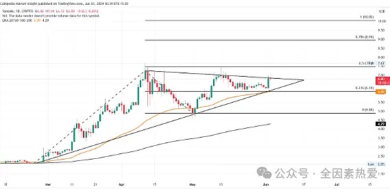 随着山寨币的看涨趋势和开放网络生态系统的扩展,上升趋势显示出持续的强烈可能性。根据基于趋势的斐波那契水平,TON 价格的看涨趋势可能会以 7.50 美元的突破为目标,达到 10 美元的里程碑。