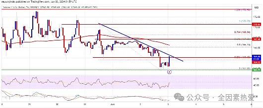 从 170 美元的波动高点到 161.50 美元的低点,在 23.6% 斐波那契回撤位上方出现了小幅波动。Solana 价格目前低于 166 美元和 100 小时简单移动平均线。即时阻力位在 165 美元附近。