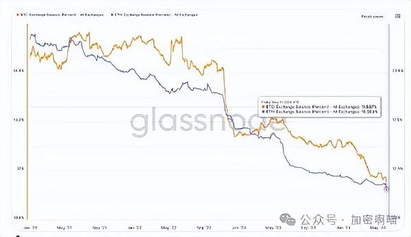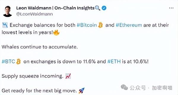 BTC-ECHO 分析师 Leon Waidmann 分享的 Glassnode 数据显示,交易所持有的以太币流通供应量百分比也处于多年来的最低水平,仅为 10.6%。