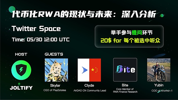 5月30日,RWA Finance研究院Bite受邀参与《RWA的现状和未来:深入分析》华语区推特直播。同PalyEstates、AirDAO、Another等项目代表就华语区RWA市场市场进行了深入交流。普遍认为RWA在西方时间发展更为超前,如稳定币、美债等用户基数和影响力巨大,而华人较多的亚洲区才刚刚起步,市场潜力大,机会红利多。