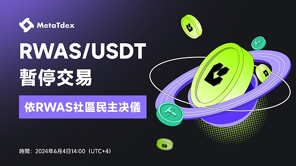 RWA Finance社区民主决议,暂停RWAS在MetaTdex交易。基于RWAS Finance 现阶段社区治理需要,经RWAS社区发起并投票决议暂停。交易对继续MetaTdex将继续展示,重启交易时间将由社区决定。RWAS当前加速了国际市场拓展和品牌力提升。