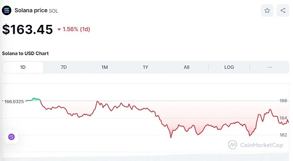 加密货币 SOL 在过去一天下跌了 1.56%,交易价格为 163.45 美元,与整体市场表现相似。该代币的 24 小时低点和高点分别为 161.65 美元和 166.33 美元。