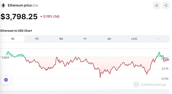 与此同时,以太坊(ETH)的价格在交易时段内主要处于下跌区域,截至发稿时下跌了 0.19% 至 3,798.25 美元。该代币的 24 小时低点和高点分别为 3,752.41 美元和 3,819.97 美元。