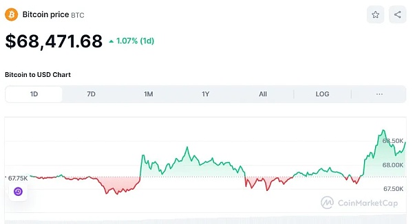 根据 Coinmarketcap 的数据,比特币(BTC)的交易价格为 68,471.68 美元,过去一天上涨了 1.07%。其 24 小时内的低点和高点分别为 67,315.53 美元和 68,743.08 美元。