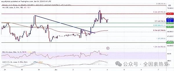 比特币目前交易价格高于 68,500 美元和100 小时简单移动平均线。它还保持了从 67,283 美元的摆动低点到 70,253 美元的高点的上行 50% 斐波那契回撤位的涨幅。从上行方面来看,价格在 69,200 美元附近面临阻力。