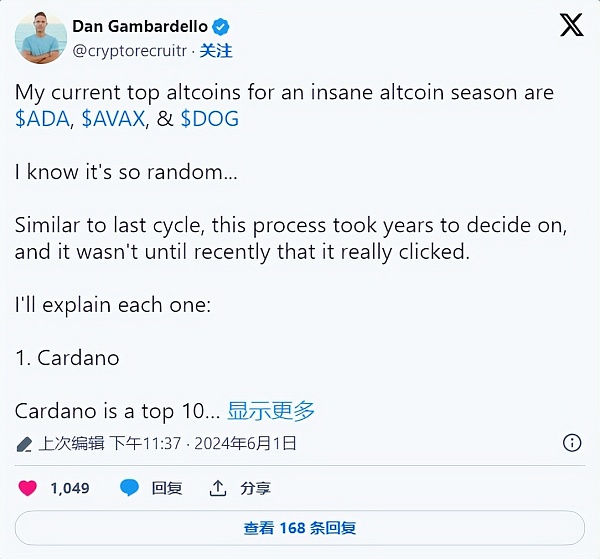 在最近的一条推文中,著名加密货币分析师 Dan Gambardello 分享了他对即将到来的牛市的三大山寨币选择:Cardano (ADA)、Avalanche (AVAX) 和 DOG。