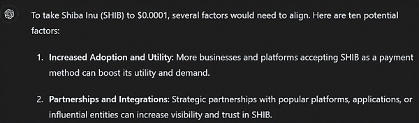 虽然预测任何加密货币的确切价格走势都具有挑战性,但 ChatGPT 4o 强调了可能将柴犬价格推高至 0.0001 美元门槛的三个关键因素。