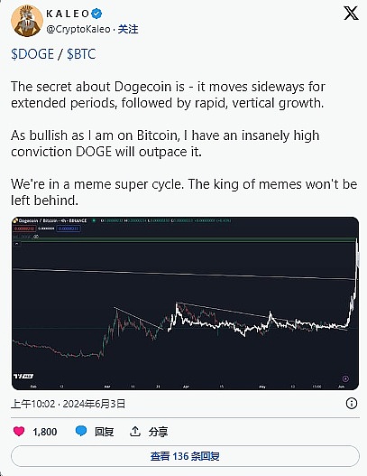 Kaleo 将 Doge 称为“模因币之王”,随后他指出,他看好 Doge,并且狗狗币可能有潜力在不久的将来超越比特币。
