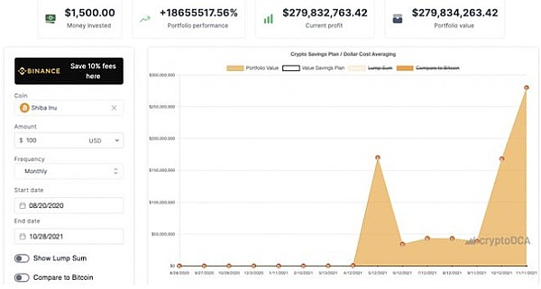 此外,如果您从 Shiba Inu (SHIB) 推出以来每月投资 100 美元,直到 2021 年 10 月达到历史最高点 0.00008616 美元,那么您将投资 1,500 美元。然而,在这种情况下,您的投资组合价值将达到 2.798 亿美元,增长约 18,655,517%(1865 万个百分点)。