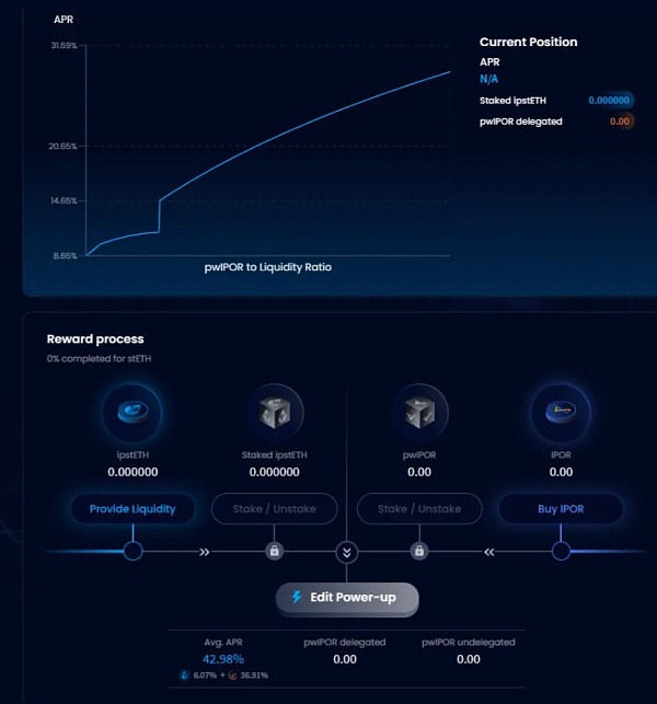 页面中,我们可以自定义选择 ipstETH 以及 IPOR 的数量,并存入池子中,这有点类似于我们在 uniswap 中自定义存入两种不同金额的代币来组成流动性池一样,其区别是这里的标的换成了质押标的币种所产生的利率。