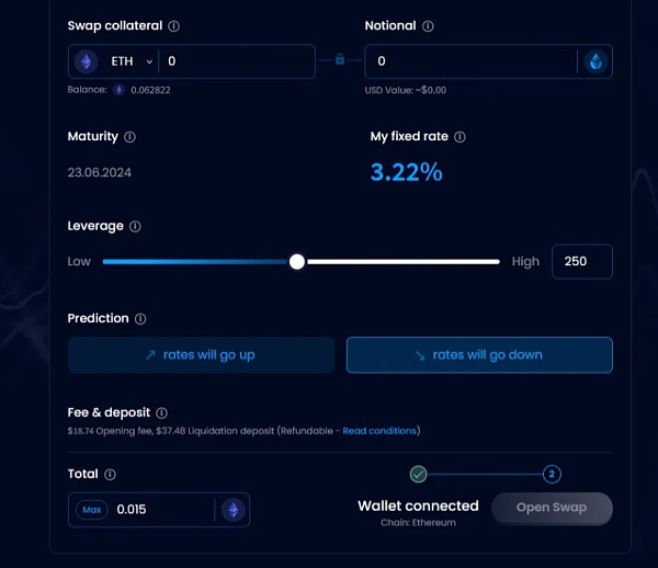 选择相应的抵押品,这里有 stETH、wETH、wstETH 以及 ETH ,选择利率上涨或下跌,以及杠杆倍率。由于利率的波动在现实情况下是非常小的,因此通过杠杆可以增加它的波动率,提高收益,目前 IPOR 可以提供最高 500 倍的杠杆。