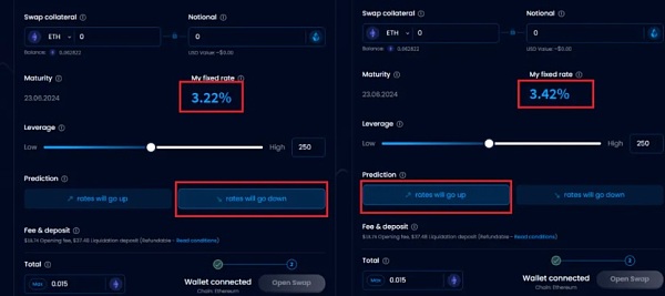 这里 fixed rate 我们可以认为是一个基础的固定利率,做空和做多的 fixed rate 是不一样的,它们之间存在差价。比如下图中,当我们选做空利率,fixed rate 是 3.22%,也就是说当利率下降到 3.22% 以下时,我们才可能获利。反之,当我们选择做多利率的时候,fixed rate 为 3.42%,也就是当利率上升到 3.42% 以上的时候,我们才能获利。