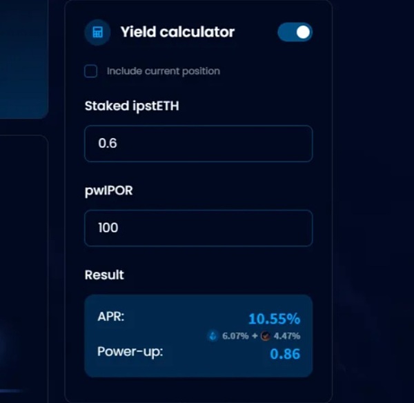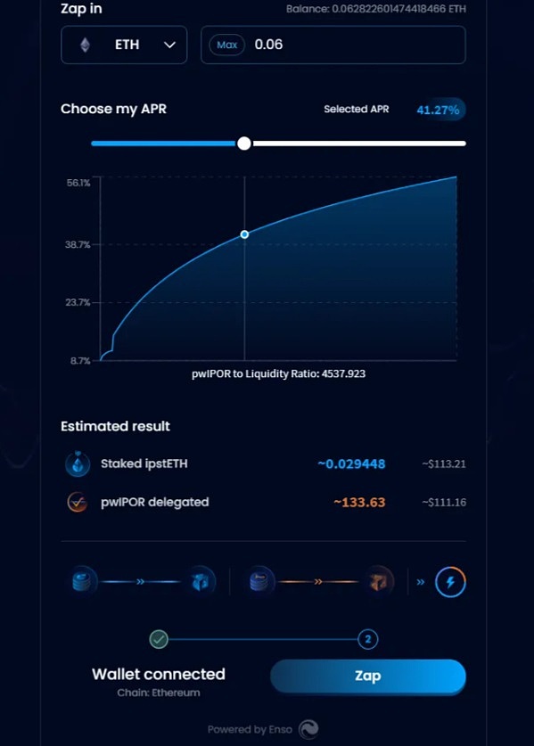在 Zap in 中,选择对应的代币名称,比如 ETH 或 USDC 等,然后选择 APR 利率,这样页面对应计算出需要质押的 ipstETH 以及 pwIPOR 数量,如果我们不想使用 pwIPOR 进行 boosting,那么可以直接将 APR 调整到 0 ,这时会获得基础 APR 。