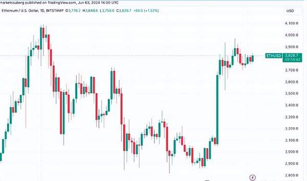 华尔街开盘时,ETH/USD 创下月度新高3,849 美元。