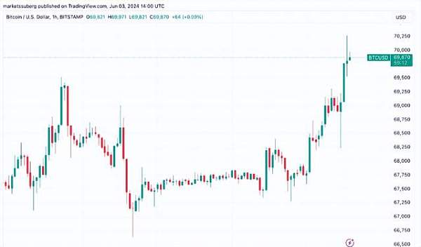6月4日,比特币美市开盘时突破70,000 美元,延续前一日收盘后的上涨势头。