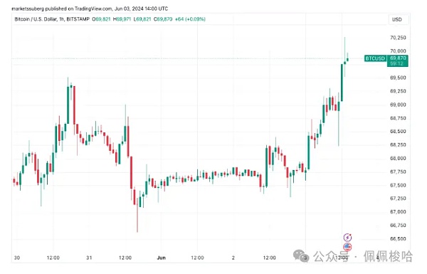 周一(6月3日),比特币美市开盘时突破70,000 美元,延续前一日收盘后的上涨势头。
