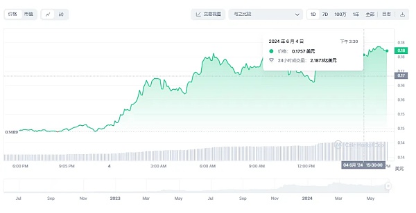 根据 CoinMarketCap 的最新数据,Kaspa 的价格为0.173919 美元,每日交易量为 216,316,409 美元。此外,KAS 表现出强劲势头,在过去一天飙升 17.97%。这些数据凸显了人们对 KAS 的兴趣和投资日益增长。