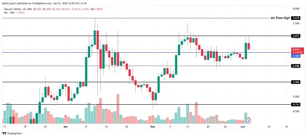 如果Toncoin的价格遵循上述路径,则可能会出现上涨行情。截至撰写本文时, TON 的交易价格为 6.60镁,它可能会突破 7.0镁的关口。几周来,这种阻力一直将山寨币压在其下方。突破可能引发整个市场的上涨行情,推高价格。目前,7.6镁标记历史新高,如果乐观情绪保持不变, Toncoin的价格可能会在 7.6镁上方形成新的 ATH。
