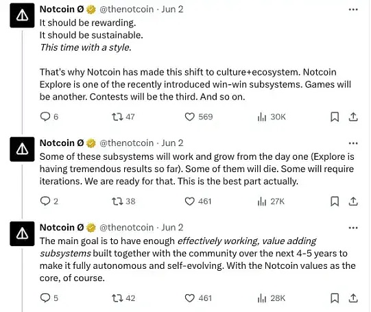 Notcoin 表示,其中一些子系统将从第一天起就开始工作和发展(到目前为止,探索已经取得了巨大的成果)。主要目标是在未来 4 至 5 年内与社区共同构建足够有效的工作、增值子系统,使其完全自主和自我发展。当然,以 Notcoin 价值为核心。