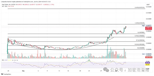随着市值接近 10 亿美元,这个模因币正在迈向 0.010 美元的心理里程碑。根据基于趋势的斐波那契回撤水平,DOGE 价格的上升趋势已准备好挑战 1.618 水平。