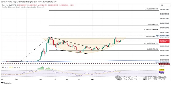 随着 meme 币的持续上涨,FLOKI 的价格趋势在日线图中形成了一个圆底形态。看涨延续形态显示颈线位于 0.00030 美元关口。