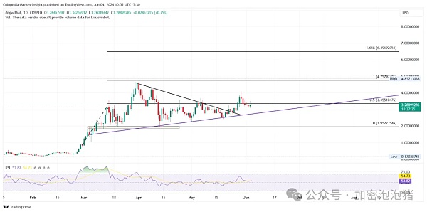 在 4 美元大关出现看跌反转后,WIF 价格在 3.35 美元大关附近波动。尽管如此,凭借稳固的支撑趋势线,模因币呈现出上升趋势。