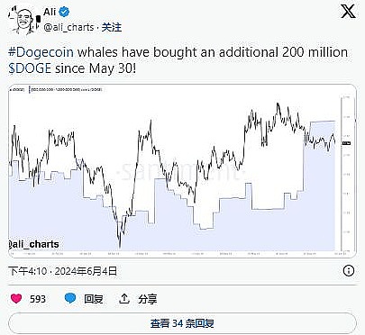 在这些挑战中,狗狗币鲸鱼最近的活动带来了一线希望。著名加密货币分析师阿里·马丁内斯 (Ali Martinez) 报告称,自 5 月 30 日以来,狗狗币鲸鱼又积累了 2 亿个 DOGE。这一重大购买活动有助于缓解近期狗狗币价格的部分下行压力,表明可能存在供应紧缩和需求增加的情况。