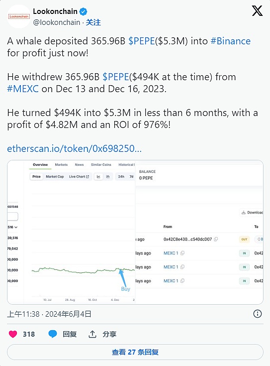 六个月后,同一个钱包里的钱从 50 万美元飙升至惊人的 530 万美元。Lookonchain 的数据显示,投资者尚未出售 Pepe Coin,并继续持有加密货币。然而,投资者本周已将代币转移到币安,这表明可能引发抛售。