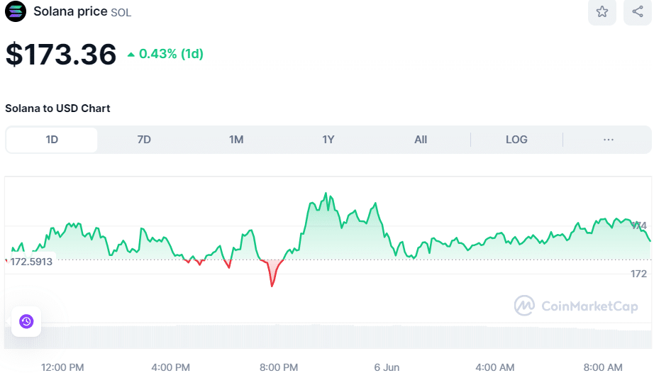 而SOL在过去 24 小时内上涨了 0.43%,至 173.36 美元。该代币的 24 小时最低价和最高价分别为 171.40 美元和 175.48 美元。