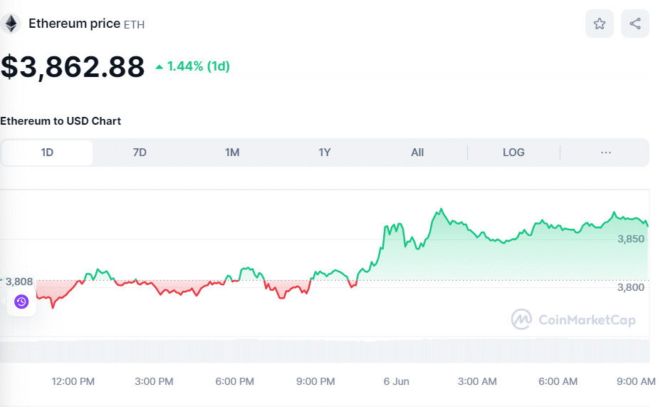 与此同时,市值第二大的加密货币价值 4639.5 亿美元,价格上涨 1.44% 至 3,862.88 美元。ETH 的 24 小时低点和高点分别为 3,778.66 美元和 3,887.49 美元。