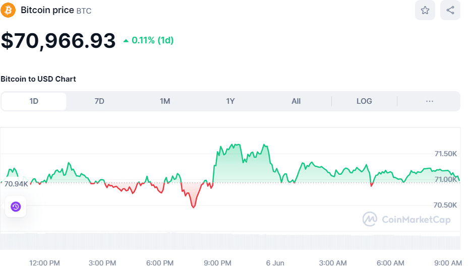 比特币今日交易价为 70,966.93 美元,过去 24 小时内上涨 0.11%。该代币的 24 小时最低价和最高价分别为 70,390.71 美元和 71,735.41 美元。