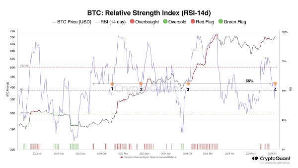 虽然 TD Sequential 可能在短期内对 BTC 造成担忧,但另一个 TA 指标可能指向该资产的看涨结果。正如 CryptoQuant 作者 Axel Adler Jr 在 X 帖子中指出的那样,比特币相对强弱指数 (RSI ) 处于近期上升趋势开始的水平。