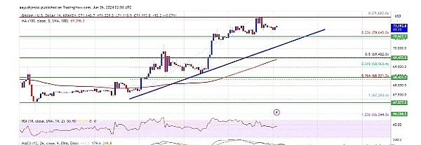 比特币目前的交易价格高于 70,500 美元和100 小时简单移动平均线。在 BTC/USD 对的小时图上,还形成了一条关键的看涨趋势线,支撑位在 70,600 美元。