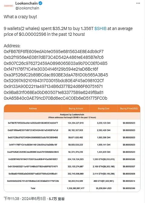 区块链分析平台 Lookonchain 发现有 9 个钱包购买了价值约 3520 万美元的 SHIB 代币。总共购买了 1.356 万亿个 Shiba Inu 代币,平均价格为 0.00002596 美元。