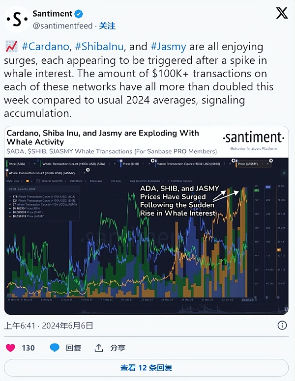 加密货币市场最近见证了 Shiba Inu (SHIB) 和 Cardano (ADA)的重大波动,因为这两种代币的大规模交易量都大幅增加。Santiment 报告显示,这种激增主要是由鲸鱼投资者的兴趣增加推动的,其特点是交易量超过 100,000 美元。